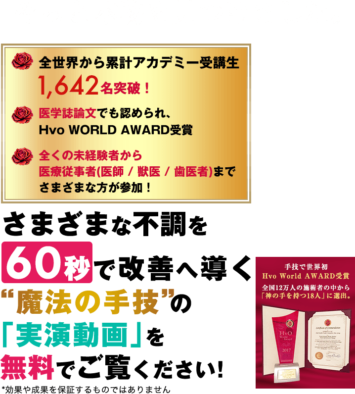 これまで延べ25万人の治療実績のデータを元に、1分で全ての疾患や痛みを改善させる独自の治療法と豊田式繁盛院経営メソッドを開発。